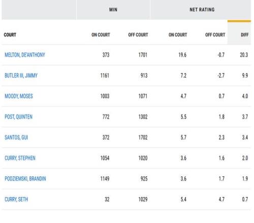 巴特勒本賽季場均20分5.6板4.9助1.4斷,命中率51.9%,他本賽季的總正負(fù)值+185全隊(duì)第一,他是否在場,對(duì)勇士的凈效率影響為+9.9,排名全隊(duì)第二,第一是梅爾頓,他的凈效率影響高達(dá)+20.3,不過梅爾頓的出戰(zhàn)時(shí)間比巴特勒少很多(巴特勒是1161分鐘,梅爾頓是373分鐘),在出場時(shí)間多的球員里,巴特勒凈效率影響遙遙領(lǐng)先,遠(yuǎn)超庫里的+2。