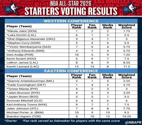 對于這套首發(fā)名單,東部名單基本屬于板上釘釘,東部五人幾乎橫掃了投票前五名。對比來看,西部名單就競爭激烈不少,背后的內(nèi)容細節(jié)也更多。