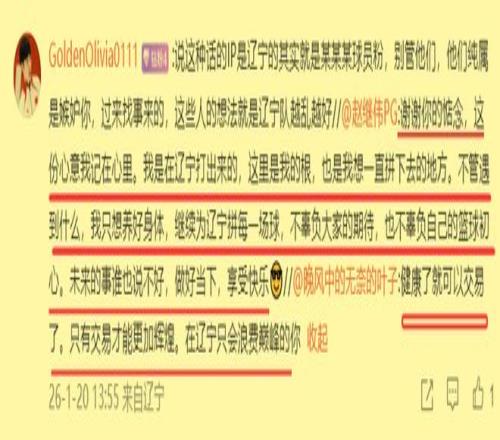 值得一提的是,對于添亂網(wǎng)友的不實猜測,遼籃隊長趙繼偉毫不客氣地進(jìn)行了駁斥。他說雖然以后的事誰也說不誰,但是任何時候他都絕對不會忘根、忘本,永遠(yuǎn)懷揣著一顆感恩的心,想一直為自己的母隊遼籃拼下去。