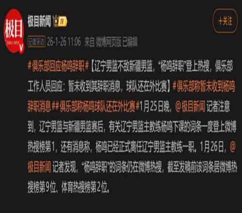 而在最新的消息中,已經(jīng)有記者打電話去詢問遼寧男籃俱樂部,俱樂部工作人員回應(yīng),目前暫時沒有收到楊鳴的辭職申請,球隊還在外比賽。