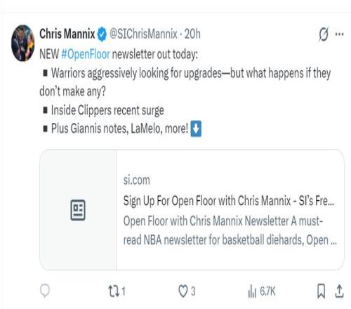 很明顯克里斯-曼尼克斯、尼克-菲爾德都覺(jué)得勇士隊(duì)?wèi)?yīng)該放眼下賽季,除非揚(yáng)尼斯真的要被交易,不然勇士隊(duì)在這個(gè)交易截止日可以不去引援,勇士還讓有交易價(jià)值的老將送走換取一些有價(jià)值的未來(lái)資產(chǎn),在今夏休賽期再進(jìn)行大規(guī)模的交易補(bǔ)強(qiáng),讓庫(kù)里26-27賽季有希望去沖冠。